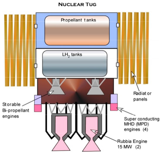 The notional Rubbia’s engine outlined in the present work has a power in the range of 30 to 50 MW. We arbitrarily assumed that it is divided into two 15 MW engines to provide some redundancy to the tug. The actual size of Rubbia’s engine has not been determined in this work, so the sketch in Figure 6 is also notional. The key to its operation is that the rejected thermal energy is not wasted in space but is partly recovered via a liquid lithium loop to power four superconducting MHD propulsion units (MPDs). In conventional spacecraft, unused heat is rejected to space via radiators; exploiting reactor waste heat in MPD thrusters does increase complexity but reduces their considerable size and mass. For reference, the radiator of the NASA SP-100 generator system weighed ~6 kg/kWth; future C/C may reduce this figure by a factor of 7 [18]. Four storable hypergolic bi-propellant engines complete the tug propulsion array and operate while in protected planetary orbits.