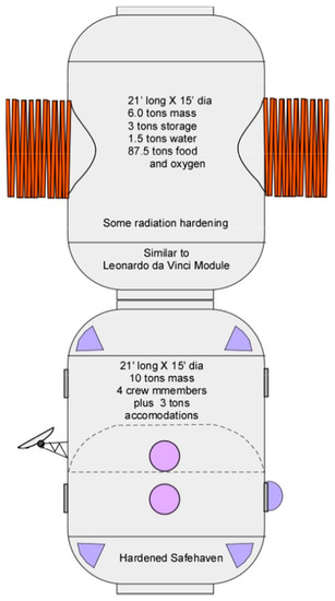 One is used as a habitat with radiation hardening sufficient to protect its human crew, a safe haven, or shelter in times of solar flares (SPE) or other radiation bursts. Depending on the radiation threat level and the mass budget, the entire habitat module could be radiation hardened. The other module is for the resources that the four-person crew needs for the nominal one-year round-trip mission. This also needs some degree of radiation hardening to protect its contents from damage.