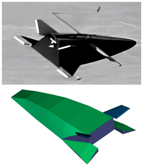 The switch blade wings were incorporated into the McDonnell Douglas Corporation (MDC) version of the glider identified as the FDL-7MDC. The CAD picture of its spatular nose configuration is shown on the bottom of Figure 10. The spatular version decreases the length to accommodate a given volume and reduces the zero lift drag [23,24]. The FDL-7 derived vehicle provides a high lift to drag ratio (of order 4) at hypersonic speeds and, in the Earth’s atmosphere, can achieve glide distances equaling the Earth’s circumference. However, the slower entry speeds and tenuous atmosphere of Mars means that the Earth’s glide wing loading of 200 psf (about 9.6 kPa) must be reduced to 50 psf (about 2.4 kPa), so the glide range will be less on Mars. The key to this configuration success is the “X” tail configuration. The upper tails are fully flying surfaces and the lower consist of a fixed fin with a trailing edge elevator.