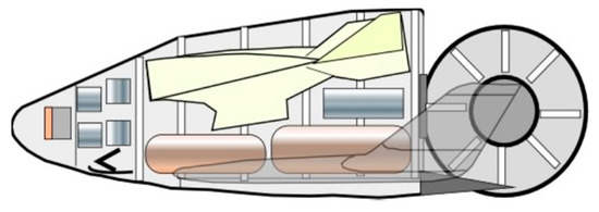 The Crew Glider, as shown in Figure 11, is designed to accommodate four astronauts in pressure suits, storage for the suits, and storage volume for food, water, and oxygen for a week’s survival. The latter is contained in a collapsible volume as is the propellant tank system located in the cargo carrying portion of both gliders. The rocket motors are sized to enable a surface launch to orbit. The Kliper based cargo glider is shown in Figure 12, one of the many sketches that have appeared in the early 2000 in the Russian literature. With its removable rear bulkhead, access to its payload is made more straightforward.