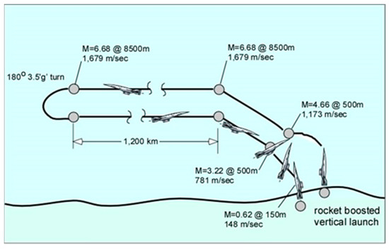 Note that the rocket booster to accelerate the ramjet burns the same silane/CO2 mixture except the CO2 has been liquified. The calculated (but realistic) vehicle range is about 2500 km with an operational radius of about 1240 km. The vehicle can be recovered and reused. A typical cruise Mach number is 4.4 at 8.5 km (equivalent to about 103,000 ft, or 31 km, in Earth’s atmosphere) that avoids dust storms and ice crystals. The sketch in Figure 16 shows a notional sequence of steps during an exploration mission. Much faster mapping of the Martian surface becomes feasible with this vehicle. Flight conditions are shown in Table 4 and are typical.
