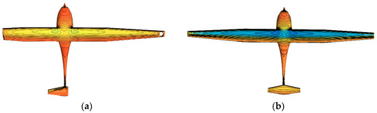 The electric aircraft pressure scalar field under the condition of combined damage of the airframe and without damage is obtained, as shown in Figure 4a,b.