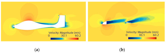 The airflow velocity field at the symmetry plane of the electric aircraft with combined airframe damage is shown in Figure 5a. The air velocity field at the lightning strike breakdown of the right wing tip under the condition of combined damage of the airframe is shown in Figure 5b. It can be seen from Figure 5b that the holes punctured by lightning at the wing tip cause dramatic changes in the airflow field, and the wing lift is affected. However, since the hole area is smaller than the wing area, the hole has little effect on the wing lift.