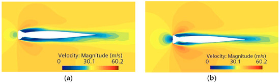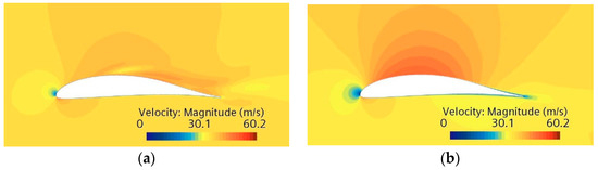 Under the condition of combined airframe damage, the air velocity fields at the 80% damage position and the symmetrical side of the right horizontal tail with ice type A are shown in Figure 7. It can be seen from the figure that after ice type A is accumulated at the leading edge of the horizontal tail, the airflow around the horizontal tail is affected by the ice type, and the airflow is disordered, which will generate additional drag. Especially when the angle of attack is increased, it can be seen that the airflow gradually separates from the horizontal tail surface. The airflow field at 80% of the damage of the horizontal tail is disordered, which reduces the lift generated by the horizontal tail.
