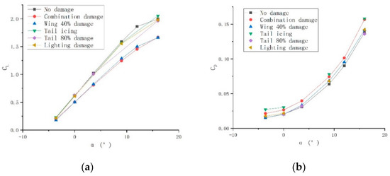 (a) lift coefficient of aircraft with combined airframe damage; (b) drag coefficient of aircraft with combined airframe damage.