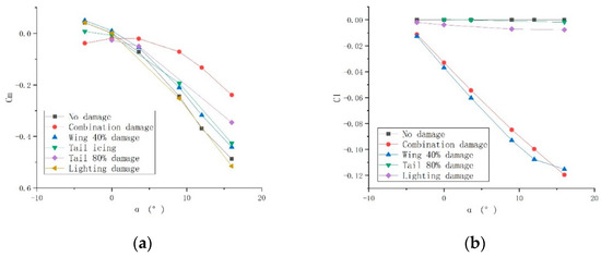 The pitching moment coefficient is shown in Figure 9a. It can be seen from the figure that the total variation of the pitching moment coefficient of the whole aircraft caused by 40% left wing damage, horizontal tail icing, 80% left horizontal tail damage, and lightning damage is equivalent to the variation of the pitching moment coefficient of the whole aircraft caused by the combined damage of the airframe, and the horizontal tail damage is the factor that has the greatest impact on the pitching moment coefficient among the combined damage types. At the same time, the wing damage and horizontal tail icing also have a certain impact on the pitching moment coefficient. Based on the face symmetry of the wing and horizontal tail of the lossless electric aircraft, it can be approximately considered that the change in the whole aircraft pitching moment coefficient caused by the combined damage of the airframe is equal to the sum of the changes in the whole aircraft pitching moment coefficient caused by various individual types of damage under the combination.
