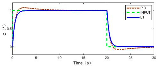 For electric aircraft without airframe damage, given the roll angle command, the roll angle response of L1 adaptive control law and PID control law is shown in Figure 10.