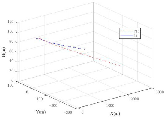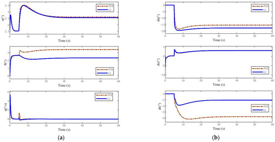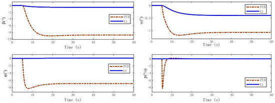 The L1 and PID control effects of aircraft under combined damage Condition 43 is described in Table 4. Under combined damage Condition 43 of the airframe, the electric aircraft has a sideslip angle () of −9°, a roll angle () of −8°, and a yaw angle () of −1.2° under the action of the PID control law. The aileron deflection angle (da) reaches −16°, the rudder deflection angle (dr) reaches −8°, and the elevator deflection angle (de) increases by 3°. The PID lateral flight attitude control effect is relatively poor. Under the action of L1 adaptive control law, the aircraft roll angle remains unchanged, the sideslip angle changes by −0.5°, the yaw angle changes by −0.4°, the aileron deflection angle reaches −20°, the rudder deflection angle reaches −3°, and the elevator deflection angle increases by 3°; that is, it can control the longitudinal and lateral directions of electric aircraft well. The PID control law in this chapter only uses proportional and differential parts of control, without adding an integral part. Therefore, when the electric aircraft under the action of the PID control law in this chapter suffers from combined airframe damage due to sudden changes in aerodynamic force and moment, as well as changes in control surface effect, the aircraft attitude control has a large steady-state error.