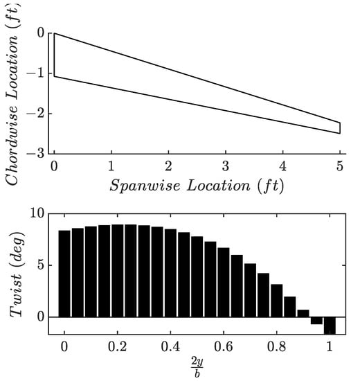 - Phillips, W.; Hunsaker, D. Designing wing twist or planform distributions for specified lift distributions. J. Aircr. 2019, 56, 847–849. [Google Scholar] [CrossRef]