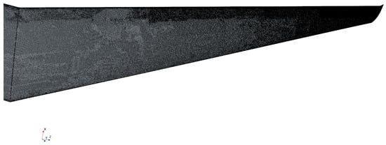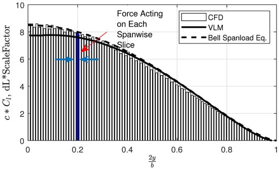 Based on the discussion leading up to Equation (7), the CFD results can be compared to the from the VLM after extracting a distribution at spanwise locations from the computational domain. This is performed in post-processing by splitting the wing into a number of sections along the span. For each section, the force over the surface is summed up in the direction of lift, taken to be perpendicular to . The distribution created using this method can then be compared directly to the VLM output. It is important, however, to note that the shape is the only characteristic that can be compared between the two, not the specific values shown. Therefore, plots in Section 3 multiply the distribution by a scale factor to match the magnitude in the center of the wing.