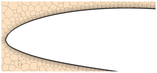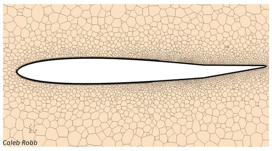 The mesh utilized for this research is a polyhedral base mesh with a set of prism layers encompassing the boundary layer of the aircraft. The computational domain included a large wake refinement—about ten wingspans past the aircraft—to resolve downstream flow features. A slight variance along the span was allowed, in the form of five span-wise volumetric refinements, so changes in cross-sectional geometry could be refined to the needs of each section, mainly due to changes in airfoil shape and chord length along the span. A small area along the trailing edge was further refined to model the stagnation point in that area. The mesh on the skin of the half-span is shown in Figure 4, and the mesh at the symmetry plane can be seen in Figure 5.