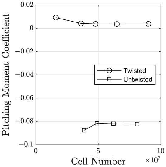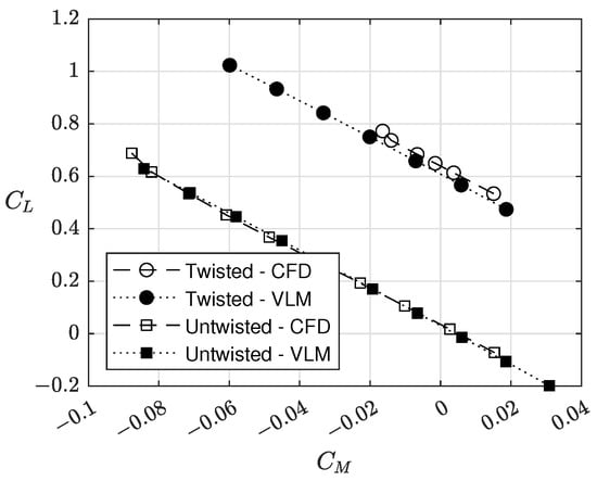 Aerodynamic moment couples need to be reported about a defined location, in order to be transferable to other locations on the geometry. Commonly, moments are reported about the aircraft center of gravity (CG) since this is the location an object rotates about. The results in this section are reported about the CG, positioned to achieve an approximately 10 percent static margin for the twisted and untwisted wing. Static margin dictates longitudinal static stability of the aircraft and is represented mathematically by Equation (10). Essentially, static margin is a measure of the distance between the center of gravity, , and neutral point, , as a percentage of the average chord, .