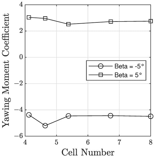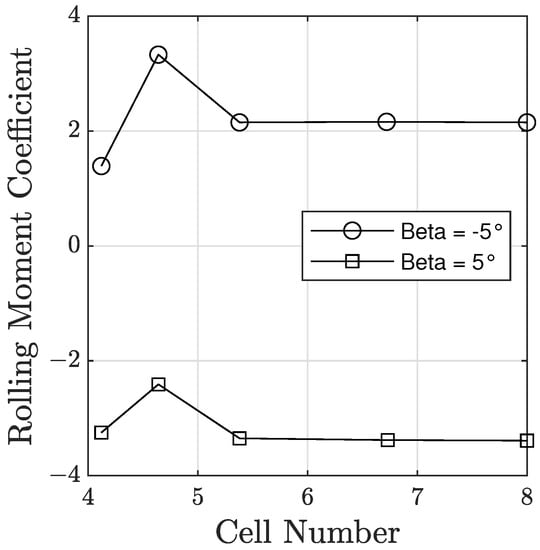 The refinements for the lateral-directional terms were tested at the design for two different angles. This was completed for both the rolling and yawing moment coefficients, denoted as and , respectively, with the two bounds to the sweep tested for refinement. The same mesh settings that produced about 45 million cells on the sweep were used for each of the cases that were not refined, and this was used as the base mesh for the cases that were refined.