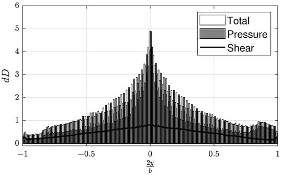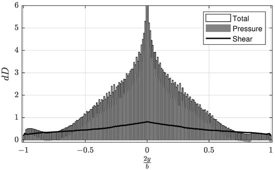 In Equation (8), is the total induced drag, is the density of the freestream flow, is the bound circulation at spanwise wing station i, is the velocity normal to the wake in the Trefftz plane at spanwise station i, and is the incremental distance along the span at section i. As the wake normal velocity in the Trefftz plane is simply the sum of all the velocity increments from each bound and trailing vortex in the lift system, the total induced drag is simply a function of the resultant distribution. Similar to the distribution, the drag force acting on wing section can extracted to study the spanwise distribution of drag and compare to VLM predictions.