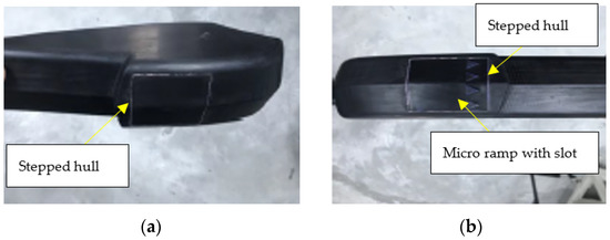 The model used for this investigation is the hull-fuselage part of WIG, which is tested in the presence of MVG as the flow control device, as indicated in Figure 2. The fuselage is designed using computer-aided design (CAD) software for better precision and modification. The fuselage model has dimensions of 0.33 m length, 0.07 m width, and 0.09 m height, which are similar to those used in a work by Said et al. [6]. Figure 3 shows the geometry of the step underneath the fuselage.