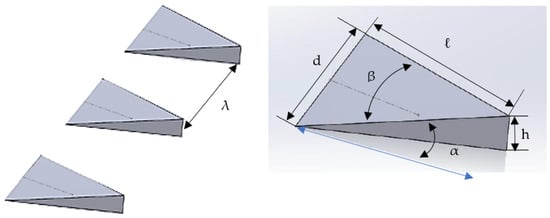 Micro-ramp is a subgroup of micro-vortex generators, with a wedge-shaped blade that can produce a counter-rotating vortex pair downstream of the MVG. A study proved that ramp-type MVG can reduce the flow separation induced by boundary layer interaction for both low-and high-speed flows by enhancing the vortex intensity in the flow field [28]. Due its effectiveness, the simple shape of the ramp-type device and its ease of installation make it the best option for a flow control device (see Figure 5). The ramp-type configuration consists of ramp width (d), ramp length (ℓ), ramp height (h), ramp angle (α), and apex angle (β), as shown in Figure 5.