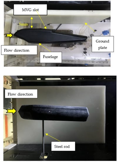 The experimental work in the wind tunnel was performed at extremely low speeds, between 1 and 10 m/s. To simulate the identical state of aerodynamic performance of the WIG aircraft, a ground plate made of polypropylene (PP) was mounted below the fuselage and secured in the test section. In this experiment, a stationary ground plate was installed inside the test section. Previous studies conducted by van Sluis et al. [36] and He et al. [37] have confirmed that the effect of using stationary and moving ground plates is similar in providing the ground effect towards the installed model inside the wind tunnel. The distance between the fuselage and the ground plate was 5 mm with an accuracy of ±1%. Figure 6 shows the arrangement of work of the fuselage for aerodynamic drag testing.