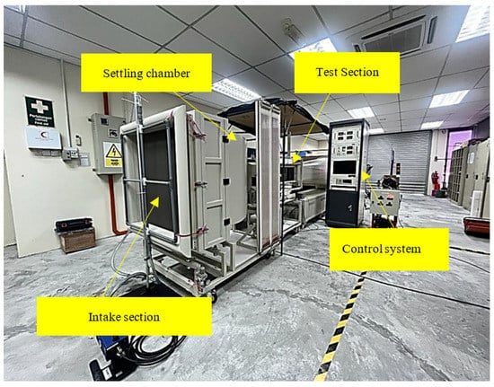 The experiments were conducted in a subsonic wind tunnel at Universiti Pertahanan Nasional Malaysia (UPNM). It is an open circuit wind tunnel with a speed range of 0 to 105 m/s, which is equivalent to a Mach number of 0.3. The test section has dimensions of 0.3 m × 0.3 m × 1 m and a wall thickness of 10 mm. It has multiple fans that can be controlled by varying the frequency at the control system. Figure 7 below shows the view of the wind tunnel system utilised in this study.