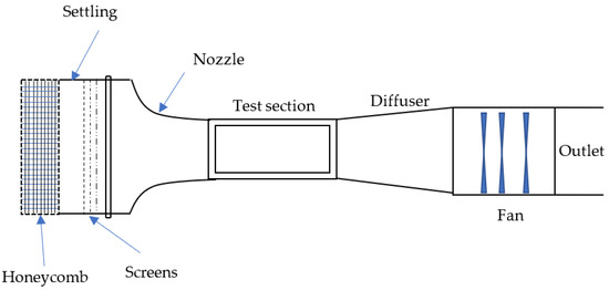 The primary elements of the wind tunnel are the honeycomb, settling chamber, screens, contraction, test section, diffuser, and fan. For the uniformity of the flow in the tubular passage, all components are crucial to obtain the accurate data; Figure 8 shows the details of the open-circuit wind tunnel schematic design in UPNM.