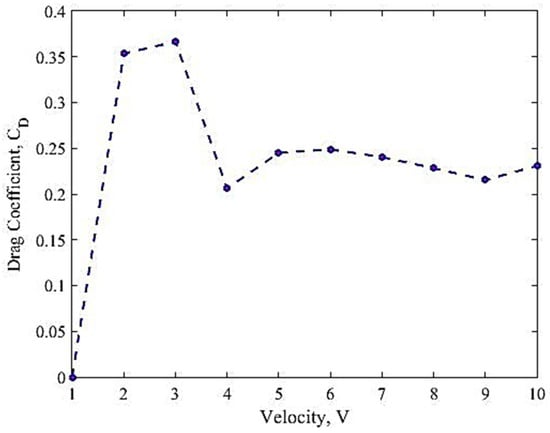 To establish a baseline for comparison with the micro-ramp slot, the WIG fuselage was first evaluated with a baseline slot model slot, which is a slot without any flow control. Wind speeds ranging from 1 to 10 m/s were applied to the fuselage, which is between Re = 6.1 × m−1 and 6.1 × m−1. Figure 9 demonstrates the results of the drag coefficient () with various velocities.