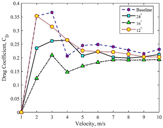 Figure 10 shows the results of the drag coefficient () of the fuselage with a micro-ramp at different angles. The baseline case has been included to observe the change in , where the angles tested are 12°, 16°, and 24°. From the graph shown in Figure 10, there was a substantial difference between the baseline case and the case with MVG flow control.