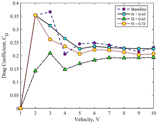 The graph in Figure 11 demonstrates that the height influences the drag coefficient for MVGs. Figure 11 shows that, overall, the presence of the MVG managed to reduce the drag coefficients compared to the baseline case. It was observed that a height of 0.4 δ did not reduce the drag coefficient significantly. This might be due to the small size of MVG, which is not capable of generating large vortices to assist in controlling the boundary layer. A comparable explanation is obtained in reference [33]. A similar reaction was observed for a thickness of h = 0.8 δ. In the range of 2 to 5 m/s (h = 0.4 δ), falls linearly below the baseline, and there is no significant decrease afterwards. The reduction recorded was about 1.2% from the baseline.