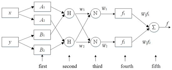 In order to realize the learning process of the T-S fuzzy model [], it is generally transformed into an adaptive network. The structure of the adaptive fuzzy neural network system is shown in Figure 1.