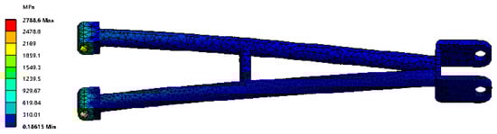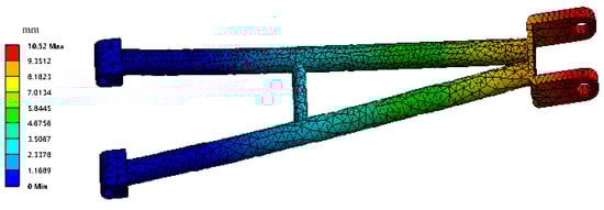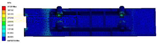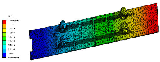 In the VEN, the operation environment of the expansion sheet is the worst, which bears huge gas pressure at high temperatures. In the process of nozzle folding, the stress level of some parts of the expansion sheet may even reach the yield limit of the material. The loads of the expansion sheet are mainly the aerodynamic pressure on the vertical bottom surface and concentrated load at the connection with the triangular connecting rod. The temperature distribution, stress, and deformation of the expansion sheet and the triangular connecting rod in the analysis time domain are obtained by thermal–structural coupling analysis, as shown in Figure 5, Figure 6, Figure 7, Figure 8 and Figure 9.