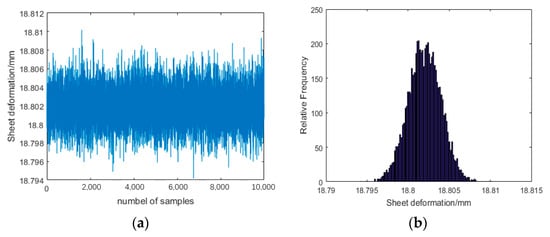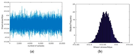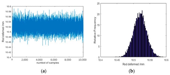 We performed 10,000 linkage sampling of the MEAFN mathematical model using the MCM to obtain the simulation sampling plots and frequency histograms of the maximum deformation and maximum stresses of the expansion sheet and the triangular connecting rod in the analysis time domain, as shown in Figure 13, Figure 14, Figure 15 and Figure 16.