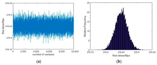 Triangular connecting rod stress: (a) Simulation sampling diagram; (b) Frequency histogram.