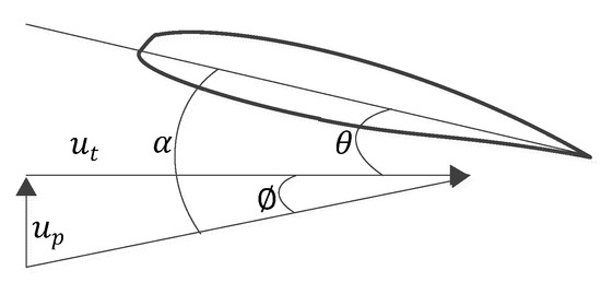 The angle of attack of the blade is determined by the pitch angle and the flow angle as shown in Figure 3 (where is angle of attack and and are vertical and lateral components of wind speed).