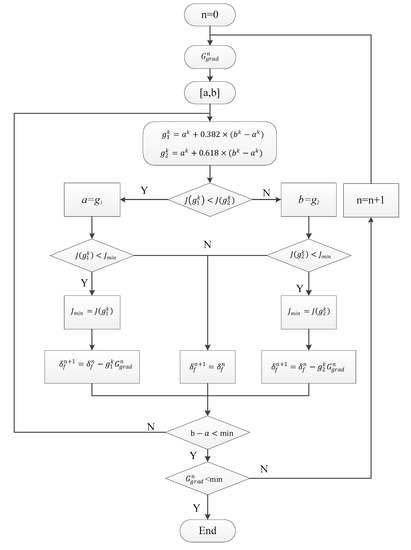 Due to the complexity of the calculation of the helicopter hub loads, the steepest descent-golden section combinatorial optimization algorithm was used to find the optimal parameters to reduce rotor vibration. The calculation process of this method is shown in Figure 6 (where represents the vibration load Fvb). The amplitudes and phases of second and third harmonics were used as the optimization variable, which was defined as in Equation (18).