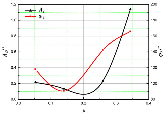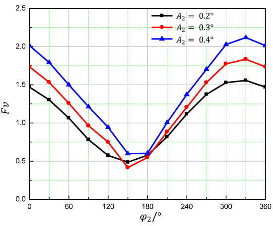 Figure 15 and Figure 16 show that although the phases were different, the trend of the influence of amplitudes on vibration load was similar. Under different phases, the amplitude of the harmonic varied slightly when the vibration load reached its minimum value.