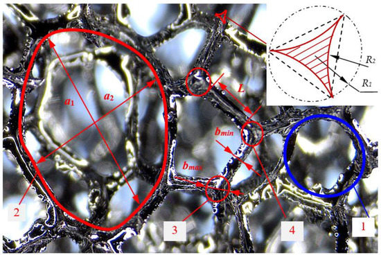 Structure parameters of open-cell carbon foam: 1—pore, 2—cell, 3—strut juncture, 4—strut, a1—larger cell diameter, a2—smaller cell diameter, bmax—strut juncture diameter, L—strut length, bmin—strut diameter.