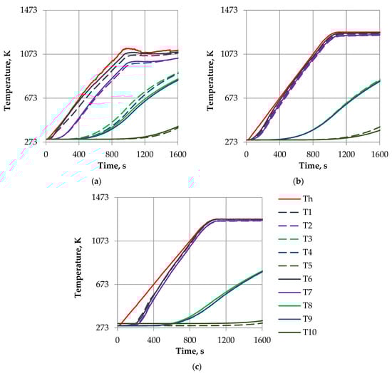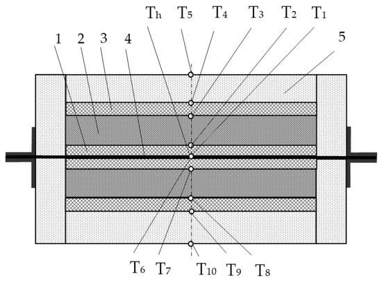 Scheme of tests with symmetrical heating of two experimental assemblies: 1—high-temperature ceramic plate (d1 = 2.95 mm), 2—high-porous cellular material specimen (d2), 3—high-temperature ceramic plate (d3 = 7.15 mm), 4—heating element (h), 5—heat insulating plate, Th, T1–T10—thermocouples.