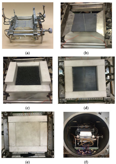 The implementation of the specified thermal regime of the panel was provided by the experimental module EM-2B used in the high-temperature thermovacuum stand TVS-1M. A methodical approach for the investigation of highly porous cellular materials’ thermal properties has been reported previously in [37,38].