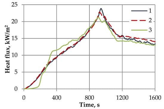During thermal tests, a symmetrical scheme was implemented (Figure 3) with conductive-radiation heating of two identical experimental assemblies, A and B, including a high-porous cellular material core (Table 2) and layers of high-temperature ceramic material. This test scheme allowed for the determination of heat flux on the surface of the heating element (Figure 4) by its electrical parameters [38]: