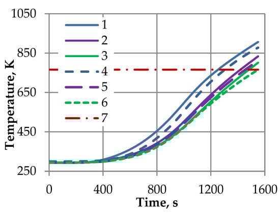 Temperature on the back surface of the three-layer sandwich panel: calculation for samples RVC-20 (1), RVC-60 (2), and RVC-80 (3); experiment for samples RVC-20 (4), RVC-60 (5), and RVC-80 (6); (7)—allowable temperature.