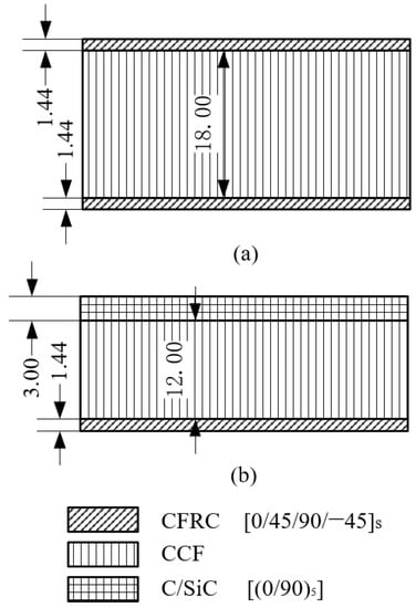 We studied the impact resistance performance of two CCF sandwich structures, shown in Figure 1, whose impacted side panels were carbon-fiber-reinforced bismaleimide composite material (CFRC) and carbon fiber/silicon carbide ceramics composite material (C/SiC), respectively. The two sandwich structures were named resin matrix composite panel sandwich structure (RPS) and ceramic matrix composite panel sandwich structure (CPS). The maximum long-term use temperature of RPS was 270 °C, and that of CPS could reach 900 °C. The CFRC structures with the grade IS2101/T800 were manufactured by Tianjin Istar Aerospace Technology Co., Ltd. The C/SiC structures with the grade GSI31 were manufactured by National University of Defense Technology. Table 1 lists the mechanical and thermophysical properties provided by the manufacturer.