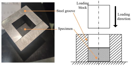 However, measuring the basic mechanical properties of porous materials cannot describe their failure behavior under multiaxial loading conditions. Therefore, multiaxial loading failure criteria must be established to solve this problem, which requires the multiaxial loading test of CCF. Gibson et al. [] and Kolluri et al. [] used the passive confining pressure (PC) test, as shown in Figure 3, to perform multiaxial loading on other foams and obtain valid data. The specimen coated with lubricating oil was set in a steel groove with an interference fit whose magnitude was 0.05 mm. The groove needed to be heated above 70 °C before assembly. The specimen was compressed by the loading block after cooling. The wall thickness of the steel groove should be large enough to ensure that the transverse strain of the specimen is approximately equal to 0 during the test so that the constraining force of the steel groove on the specimen can be solved according to the constitutive equation. Then, the stress in all directions can be obtained when the CCF fails under multiaxial loading. This test method is simple and reliable, so we conducted a PC test in all three directions on CCF.
