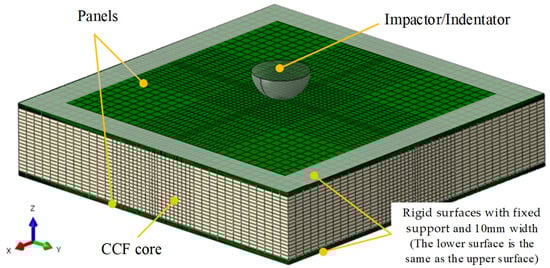 Eight-node brick element (C3D8R) was used in the whole model, while the stiffness-based hourglass control was used in the CCF core to prevent an hourglass issue in large deformation. From the central region to the edge region, the mesh size was 0.77 mm × 0.77 mm, 1.54 mm × 1.54 mm, and 3.33 mm × 3.33 mm, respectively. In the test, the interface between the panels and the core was not damaged, so the elements at the junction of the panels and the core were set as common nodes. Due to the small pre-tightening force of the bolts, the extrusion effect of the metal plate on the specimens could be ignored. The two metal plates had enough rigidity to limit the z direction displacement of the specimens, so the metal plates could be simulated by the rigid surfaces with fixed support, and a contact pair was set between the metal plates and the panels.