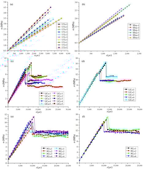 The stress-strain curves of mechanical tests for CCF: (a) UT tests; (b) SS tests; (c) UC tests in x/y direction; (d) UC tests in x and y directions; (e) UC tests in z direction; and (f) PC tests.