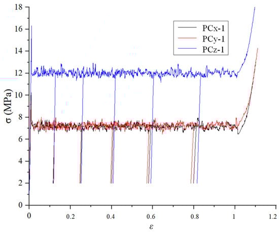We selected one specimen of the PC test from each direction for the unloading and reloading test. The stress-true strain curves are shown in Figure 13, and the slopes of the reloading curve are listed in Table 11. The difference among several slopes was minimal, so it can be considered that the modulus of CCF remained unchanged in the platform section.
