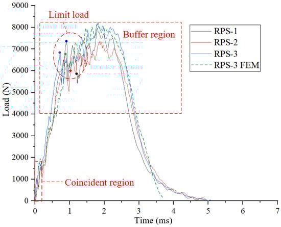 The load-time curves of the RPS low-velocity impact test are shown in Figure 14, from which it can be seen that the curves of RPS-1 and RPS-2 with the same impact energy almost coincided before reaching the limit load, indicating that the consistency of the tests was good. The curves have the following characteristics: (1) All the curves are approximately coincident at the beginning, and the panels and cores are not damaged in the coincident region. (2) After the coincident region, the specimen starts to become damaged, and higher impact energies lead to steeper curve slopes before limit loads are reached. (3) After reaching the limit load, the load enters the buffer zone, and the maximum load oscillates within a specific range. The sandwich structure at this stage absorbs impact energy through CCF crushing, while its modulus and platform stress remain almost unchanged. (4) The impactor rebounds, and the load decreases. The results of FEM are in good agreement with the test results of RPS-3 and can effectively simulate the limit load of RPS and the curve in the buffer region.