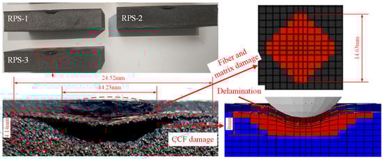 The sections of the RPS low-velocity specimens cut along the center line are shown in Figure 15. The perspective of cross-sectional damage morphology shows that the test results have a good consistency. Local matrix cracking and fiber breakage occurred at the position where the panel contacted the impactor. The damage on the foam was a “D”-shaped indentation. The crushing depth in the center of the indentation was relatively large and extremely small at the edge. The parameters of the curves and indentation of the RPS low-velocity impact test are shown in Table 12. Figure 15 shows the damage morphology simulation results of the maximum impact energy test (RPS-3). It can be seen that the panel damage under the impactor was mainly a fiber and matrix fracture. The panel damage near the impactor was difficult to obtain from the specimen section, but a large amount of delamination damage can be seen in the FEM results. The area of delamination damage was much larger than the area of the fiber and matrix fracture. The calculated indentation diameter was 15 mm, 5.13% larger than the experimentally measured 14.23 mm. The calculated indentation depth was 4 mm, 3.50% smaller than the experimentally measured 4.14 mm. The calculation errors of these two critical damage characteristic parameters were all within the acceptable range, which further verified the model’s accuracy.