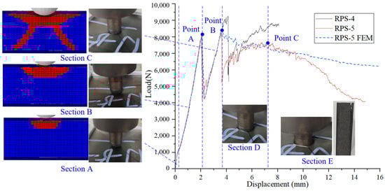 The load-displacement curves of the RPS quasi-static indentation tests are shown in Figure 16, from which it can be seen that the curves of RPS-4 and RPS-5 almost coincided before the indentation depth reached 3.81 mm, indicating that the consistency of the tests was good. The curves have the following characteristics: (1) In Section A, the curves have good linearity, and the specimens are not damaged. (2) In Section B, the panels directly under the indentation are partially damaged, and the area away from the indentation (marked by the red dotted line in Figure 16) is accompanied by the sinking of the indentation, causing the foam below to collapse. The curves at this stage also show apparent linearity because the modulus and platform stress do not change during the foam-hardening stage. After the curves reach Point A, the load drops sharply, and the specimens emit a clear sound for the first time. (3) In Section C, the slopes of the curves are smaller than those in Section B due to the more severe damage in the specimens. When loading to Point B, the fiber of the panel is completely broken, and the indentator penetrates the panel. At this time, specimens emit clear sounds for the second time. RPS-4 and RPS-5 almost completely overlap before Point B, which shows that the destruction before Point B is relatively regular. (4) In Section D, the curves rise with fluctuation, which is related to the fluctuation of CCF in the platform section. The indentation starts to contact the CCF directly, and as the spherical indentation deepens, the contact area between the indentator and the CCF increases continuously, increasing the load. When loading to Point C, the specimens emit a clear sound for the third time, and the back panel separates from the CCF. (5) In Section E, the specimens lose the ability to resist indentation.