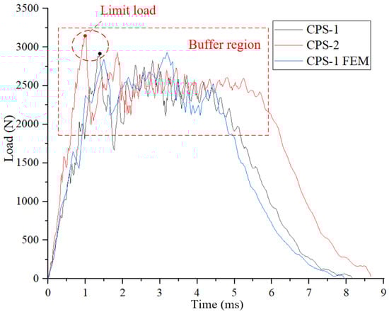 The load-time curves of the CPS low-velocity impact test are shown in Figure 18. The average loads in the buffer region of the two curves in Figure 18 are close. This result is consistent with the phenomenon observed in Figure 14, indicating that when the core material was the same, the impact energy had little effect on the average load of the buffer region. The limit loads of CPS and the average loads of the buffer region were significantly lower than that of RPS because the strength and modulus of CMC were significantly lower than that of CFRC.
