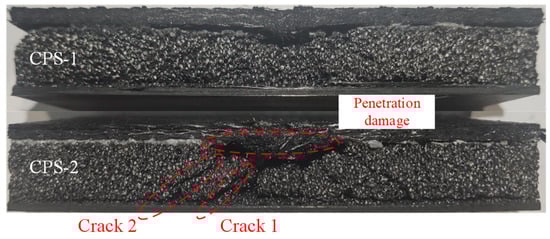 The sections of the CPS low-velocity specimens cut along the center line are shown in Figure 19, and the results of the CPS low-velocity impact test are shown in Table 13. It can be seen that the damage morphology of CPS was similar to that of the RPS quasi-static indentation test, which indicates that the damage processes of the two sandwich structures under low-velocity impact were similar, while the impact resistance of CPS was weaker.