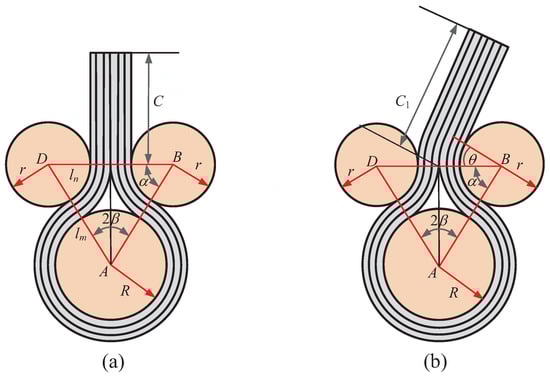 To investigate the large deformation of stacked flexure hinges, the stacked spring sheets and the hinge lower cover from Figure 1 are extracted, as shown in Figure 2. The main structure includes a fixed axis with a radius of R, two clamping axes with a radius of r, and the stacked spring sheets. In the diagram, and represent the central angles of the arc segments corresponding to the radii r and R, respectively. denotes the axial distance between the fixed axis and the clamping axes, while represents the axial distance between the two clamping axes. and correspond to the arc segment lengths of the central angles and , respectively.