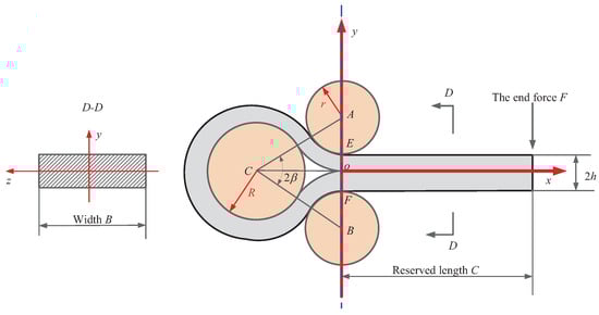 The large-deformation analysis model of the flexure hinge is illustrated in Figure 3. The flexure hinge is divided into two parts, the left end and the right end, with the axis of the clamping shafts (blue dashed lines) serving as the boundary. Since the left end of the flexure hinge experiences negligible deformation, it is treated as a fixed end, while the right end is considered equivalent to a cantilever beam. In order to facilitate the stiffness calculation of the flexure hinge, the following assumptions are made: